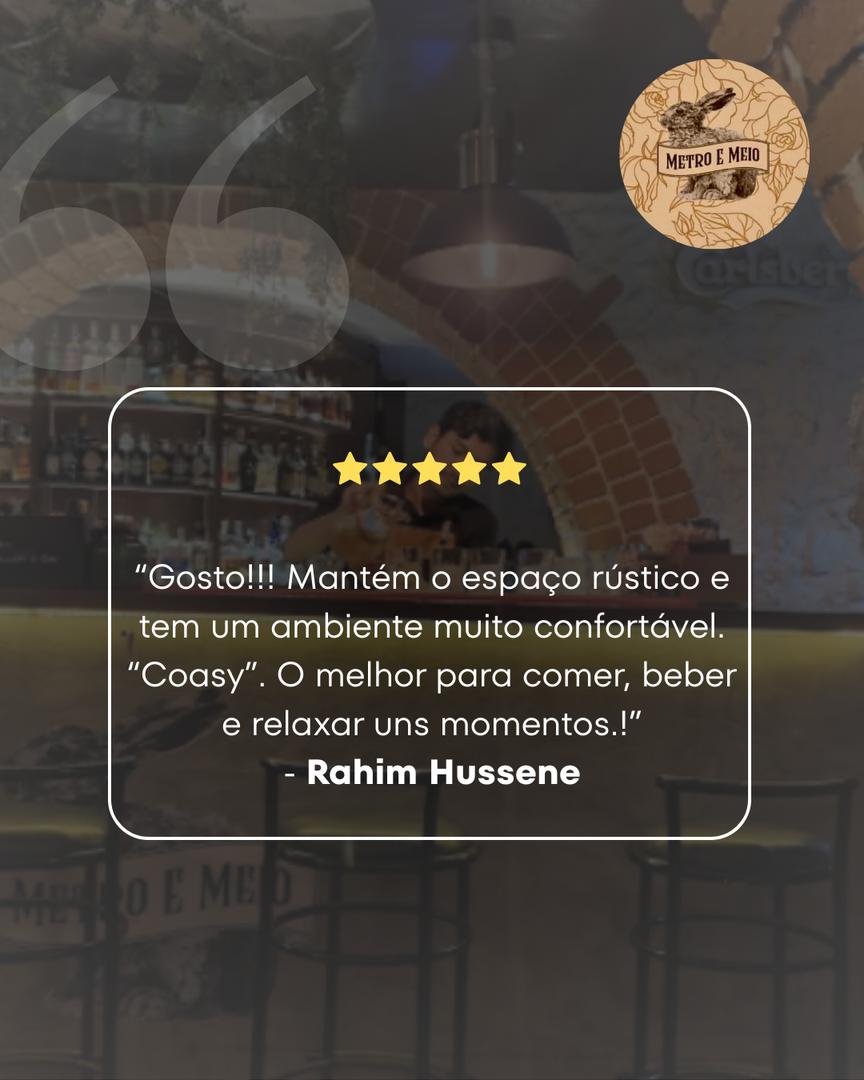 Metro e Meio – Restaurante & Cocktail Bar distingue-se pela sua proposta gastronómica contemporânea e pelo ambiente sofisticado no coração da Avenida 5 de Outubro. A cozinha privilegia ingredientes de qualidade, combinações equilibradas e apresentação cuidada, enquanto o bar oferece cocktails de autor preparados com precisão. Com serviço atento e atmosfera elegante, o Metro e Meio é a escolha ideal para quem aprecia gastronomia moderna e momentos bem vividos em Lisboa. Uma experiência pensada ao detalhe.